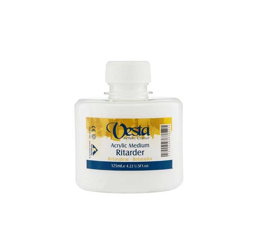 ریتاردر وستا مایعی نیمه شفاف است که زمان خشک شدن رنگ اکریلیک را افزایش می دهد و به آرامی درخشندگی رنگ را بیشتر می کند و لایه های رنگ را به صورت مشخص تری نشان می دهد. چند قطره از آن را به رنگ اکریلیک مورد نظر اضافه کنید، و با قلمو، رنگ و ریتاردر را ترکیب